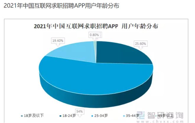 據(jù)相關(guān)數(shù)據(jù)顯示,從2021年中國互聯(lián)網(wǎng)求職招聘APP用戶年齡分布來看,25-34歲的年齡階段群體占比超50%,達到54%;其次,18-24歲的占25.6%;35-44歲的占19.4%;45歲以上的占0.8%,18歲以下的占0.2%,當(dāng)然,這僅僅是2021年的數(shù)據(jù)。相信在2022年,這個數(shù)據(jù)更是呈現(xiàn)年輕化趨勢。